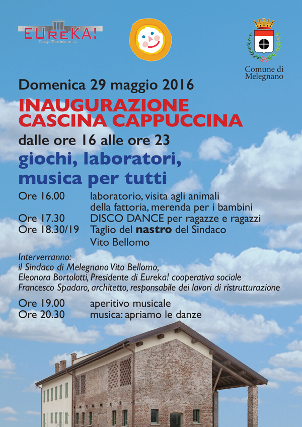 Per festeggiare l’inaugurazione di Cascina Cappuccina, la Cooperativa Eureka! ha voluto regalare ai melegnanesi e a tutte le persone curiose di scoprire questo piccolo gioiello alle porte di Milano una domenica di festa. L’invito è per il 29 maggio ed è aperto a tutti: dal pomeriggio a tarda sera (si inizia alle 16, si terminerà alle 23) bambini, ragazzi, ragazze e adulti potranno visitare la Cascina, divertirsi con giochi e laboratori, far festa a ritmo di musica, familiarizzare con gli animali della fattoria.