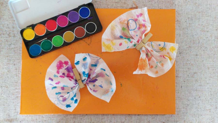 Per prima cosa i bambini si divertiranno a dipingere, con i colori preferiti, il foglio di carta assorbente con un pennello e gli acquarelli (il foglio di carta assorbente diventerà le due ali della nostra bellissima farfalla). Una volta passato il tempo utile per farlo asciugare farete una leggera arricciatura centrale dove posizionerete la molletta di legno che fungerà da corpo. La molletta si può decorare con i pennarelli disegnando gli occhi e le antenne.