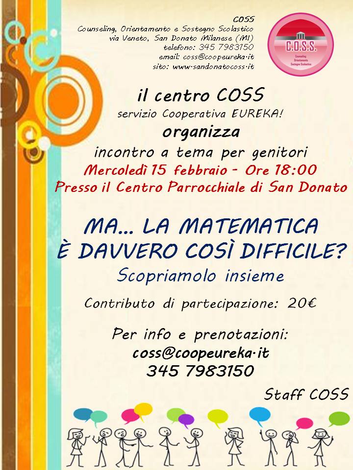 Nell’incontro di Mercoledi 15 Febbraio 2017 alle ore 16 presso il Centro Parrocchiale di San Donato, gli esperti del COSS cercheranno di dare una risposta a queste domande per aiutare i genitori ad identificare i problemi di apprendimento della matematica. I posti sono limitati e si consiglia la prenotazione.